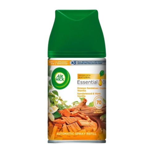 Air Wick пълнител за автоматичен комплект Сандалово дърво и Ванилия.Отдайте се на деликатния аромат на ванилия, съчетан с енергизиращ аромат на сандалово дърво и сочни нотки на азиатска круша.
