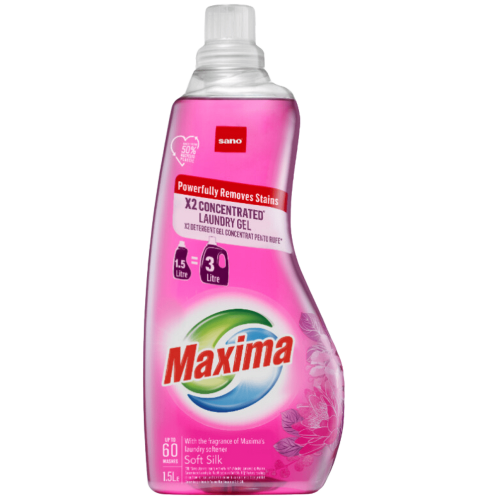 Sano Maxima Soft Silk е ултра концентриран гел за пране, подходящ за всички видове пране, включително и най-деликатните тъкани. Ефикасен дори при изпиране със студена вода или при ниски температури на вашата пералня машина. След употреба придава на дрехите Ви освежаващият и приятен аромат на омекотителя за тъкани Soft Silk на Sano Maxima.