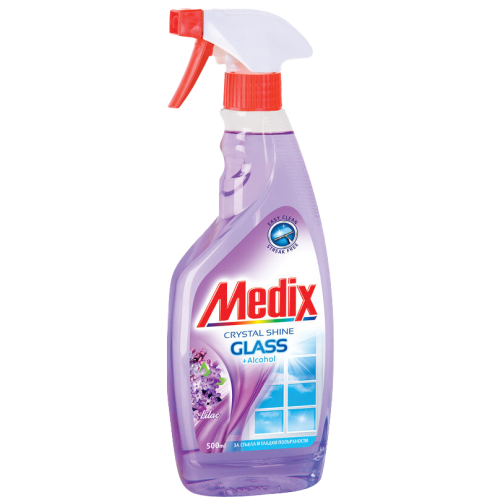 За чистота и свежест с всяко пръскане – открийте мощната формула с алкохол за почистване на стъкла и гладки повърхности от MEDIX GLASS, съчетана със свежо ухание като току-що откъснат люляк.