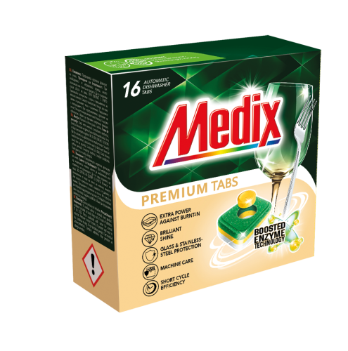 MEDIX PREMIUM TABS са таблетки за измиване на съдове в съдомиялни машини. Притежават BOOSTED ENZYME TECHNOLOGY – иновативна технология, съчетаваща действието на ензимен комплекс, подсилен с алкални агенти и активен кислород, за безупречно отстраняване на мазнини и загорели остатъци от храна без необходимост от предварително накисване на съдовете. Високоефикасни и при кратки програми и ниски температури. MEDIX PREMIUM TABS осигуряват кристален блясък и защита на домакинските прибори от стъкло и неръждаема стомана дори при недостатъчни количества сол и препарат за изплакване в съдомиялната машина