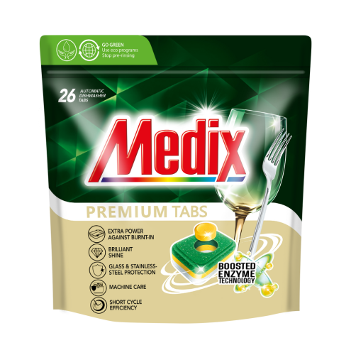 MEDIX PREMIUM TABS са таблетки за измиване на съдове в съдомиялни машини. Притежават BOOSTED ENZYME TECHNOLOGY – иновативна технология, съчетаваща действието на ензимен комплекс, подсилен с алкални агенти и активен кислород, за безупречно отстраняване на мазнини и загорели остатъци от храна без необходимост от предварително накисване на съдовете. Високоефикасни и при кратки програми и ниски температури. MEDIX PREMIUM TABS осигуряват кристален блясък и защита на домакинските прибори от стъкло и неръждаема стомана дори при недостатъчни количества сол и препарат за изплакване в съдомиялната машина